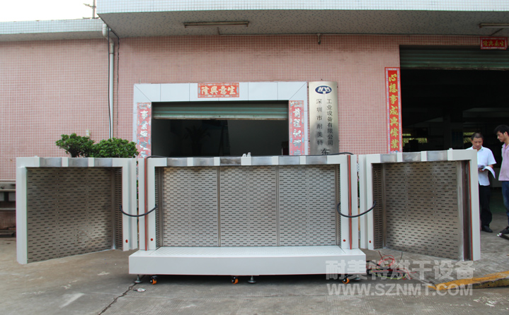 外形材質采用2mm厚冷板折彎而成,表面高溫靜電噴塑(非普通油漆)耐腐蝕,防生銹,外形尺寸:寬2.6米,深0.85米,高1.3米,雙開門,配加強型鍍鉻方鋼門鎖,拉手,鍍鉻加強型合頁,烤箱頂箱開有6個∮250孔.